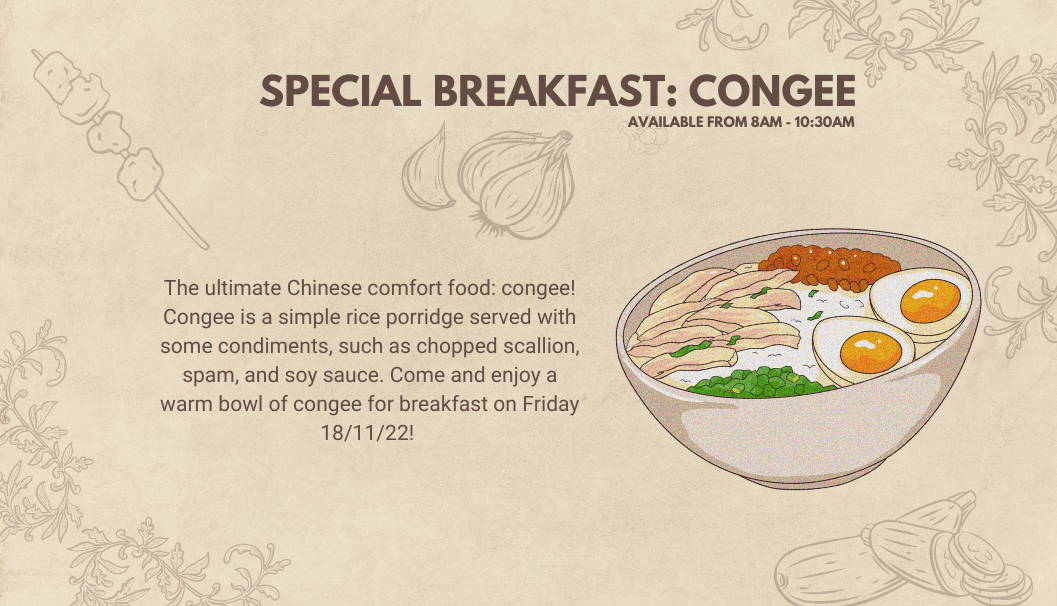Come down between 8AM-10:30AM this Friday, 18th November for a warm bowl of congee made with love in IgluĀ